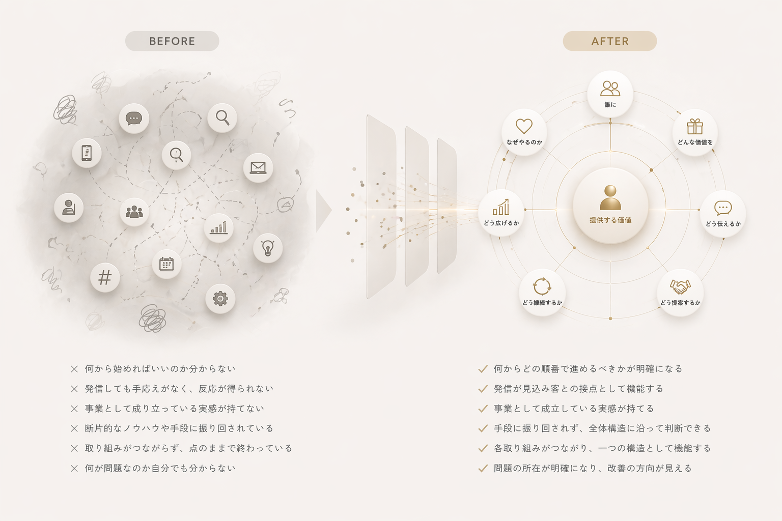 その価値が、どのような前提や文脈で伝わるのかを整える。どれだけ価値があっても、伝わり方がバラバラでは、その都度、別のものとして認識されてしまいます。なぜその価値を提供しているのか。どのような背景や課題に対してのものなのか。その文脈を一貫させることで、価値の意味が正しく伝わり、選ばれる理由が明確になります。