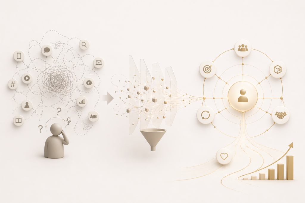 独立系コンサルタント事業は、「人と人とのつながり方」の中で成立します。価値は一方的に提供されるものではなく、相手理解と自己理解を通じてフィットし、信頼が生まれ、相互理解へと進んでいきます。このプロセスを前提に、発信、導線、提案を設計することで、無理に売り込むのではなく、関係性の中で選ばれる状態をつくっていきます。CBMでは、この1to1の関係性を起点に、事業全体の設計を行います。