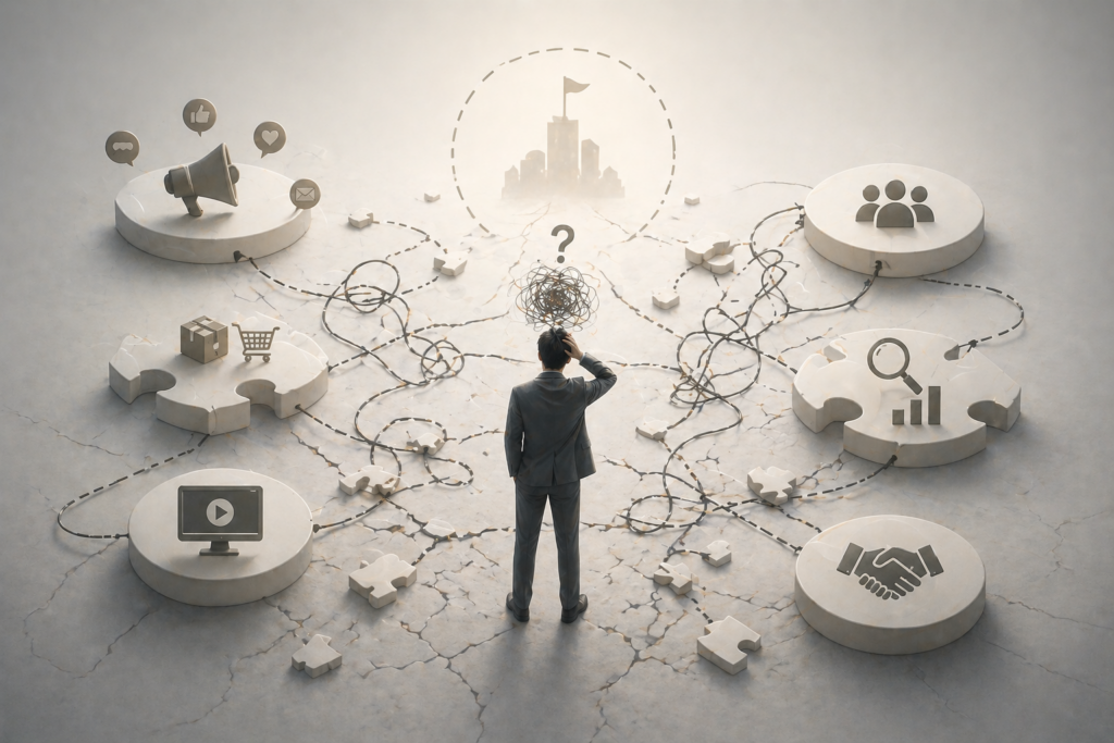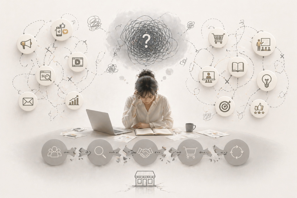 価値のある商品やサービスを持っているにもかかわらず、うまく伝わらず、選ばれていない。発信や集客に取り組んでいるものの、手応えがなく、結果につながっている実感が持てない。学びやノウハウを取り入れても、結局どこかで止まってしまい、事業として成立している感覚が持てない。そして多くの場合、何が問題なのかがはっきりしないまま、発信、商品づくり、集客といった“部分的な取り組み”を繰り返してしまいます。その結果、それぞれは間違っていないはずなのに、全体としてつながらず、ビジネスとして機能しない状態に陥ってしまいます。